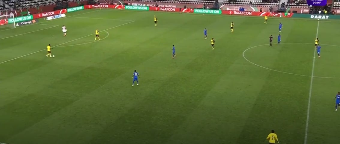 Nouhou Tolo’s role was key. Acting as an auxiliary centre-back, his movements allowed Cameroon to oscillate between a back four and back three during build-up, maintaining numerical advantages.