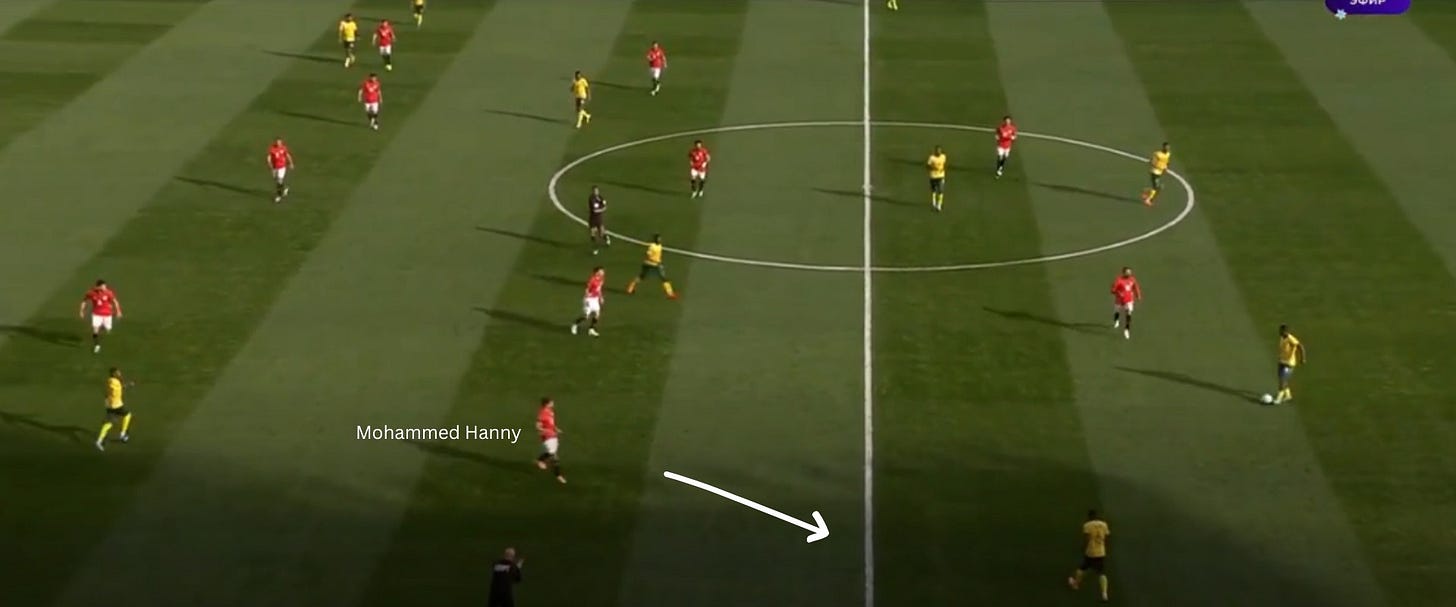 Egypt’s out-of-possession scheme amplified this. Mohamed Hany’s high starting position triggered coordinated shuffling movements behind him, maintaining pressure in the middle third while accepting ball-far freedom.