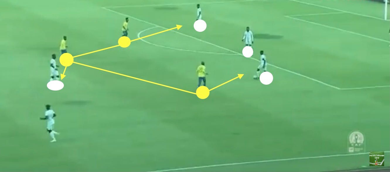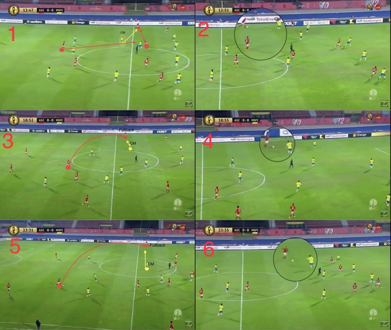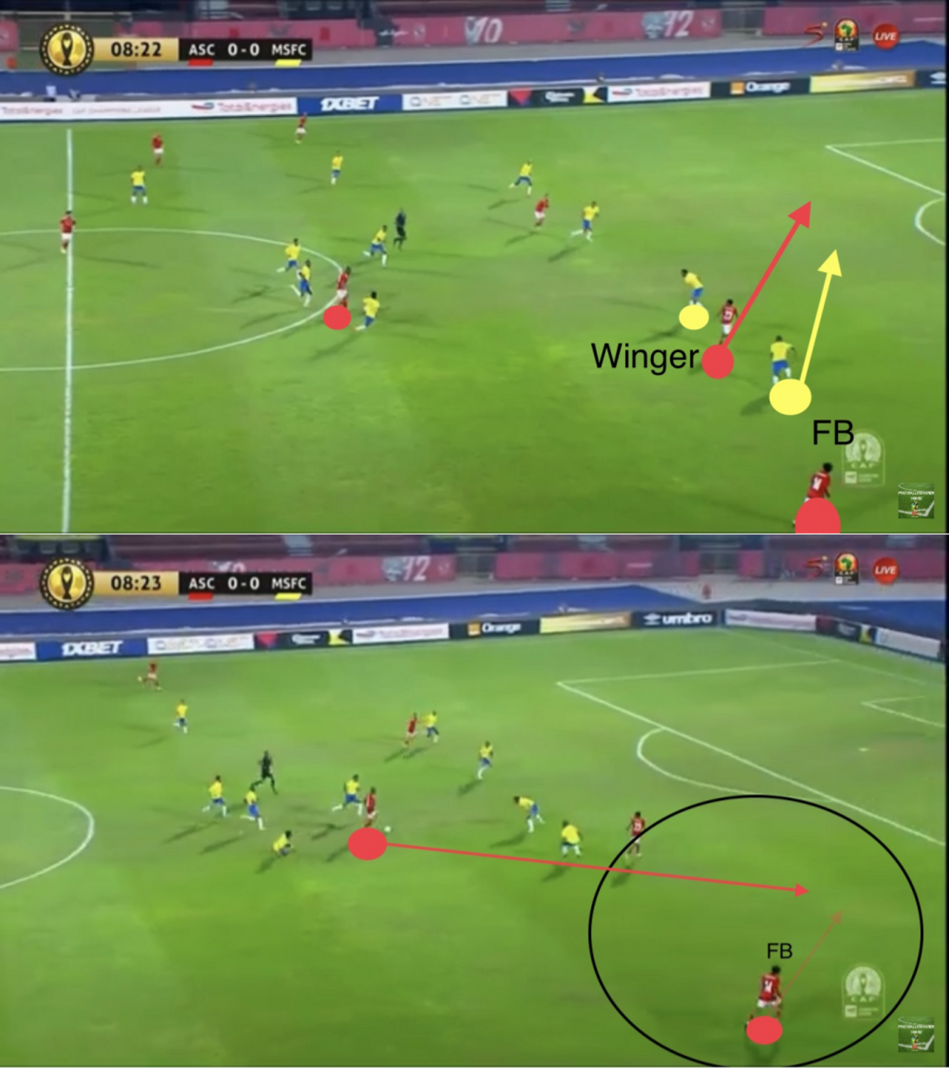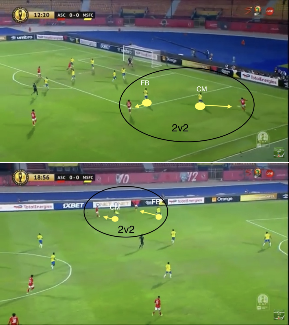 Al Ahly is renowned for using their full-backs to attack and create wide overloads, Rulani had to come up with something to avoid those 2v1s in wide areas,
