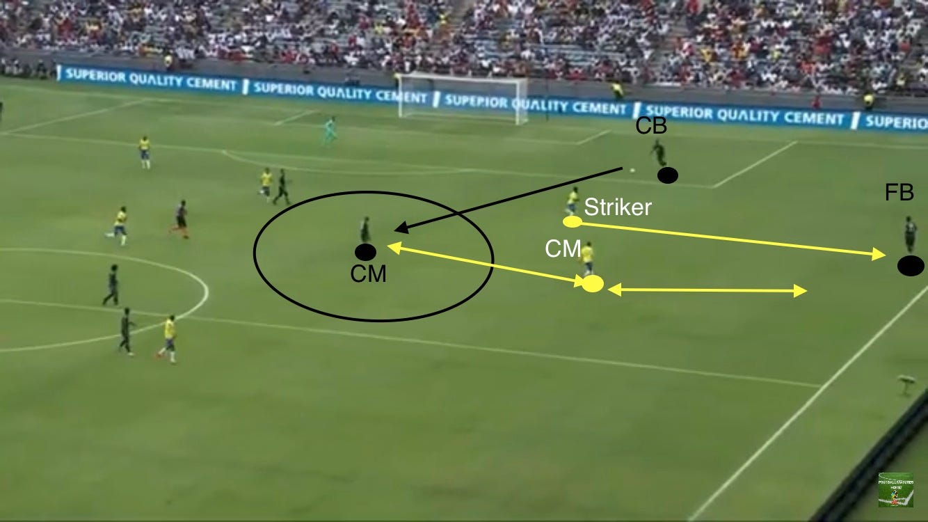 If Zwane stays with one of the midfielders, the other has the freedom to drop deep, collect the ball and advance into space created by their other centre midfielder pulling his marker from the central area which can lead to line-breaking passes into midfield (as shown above).