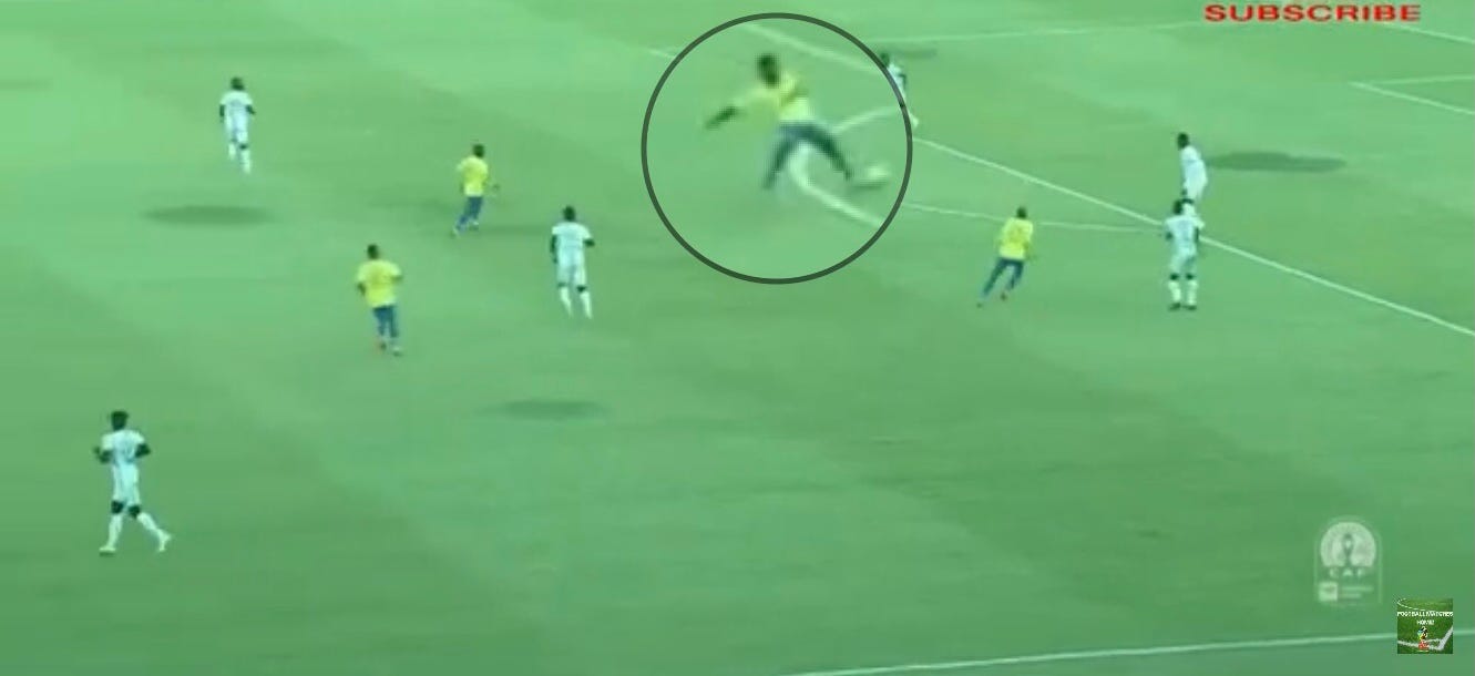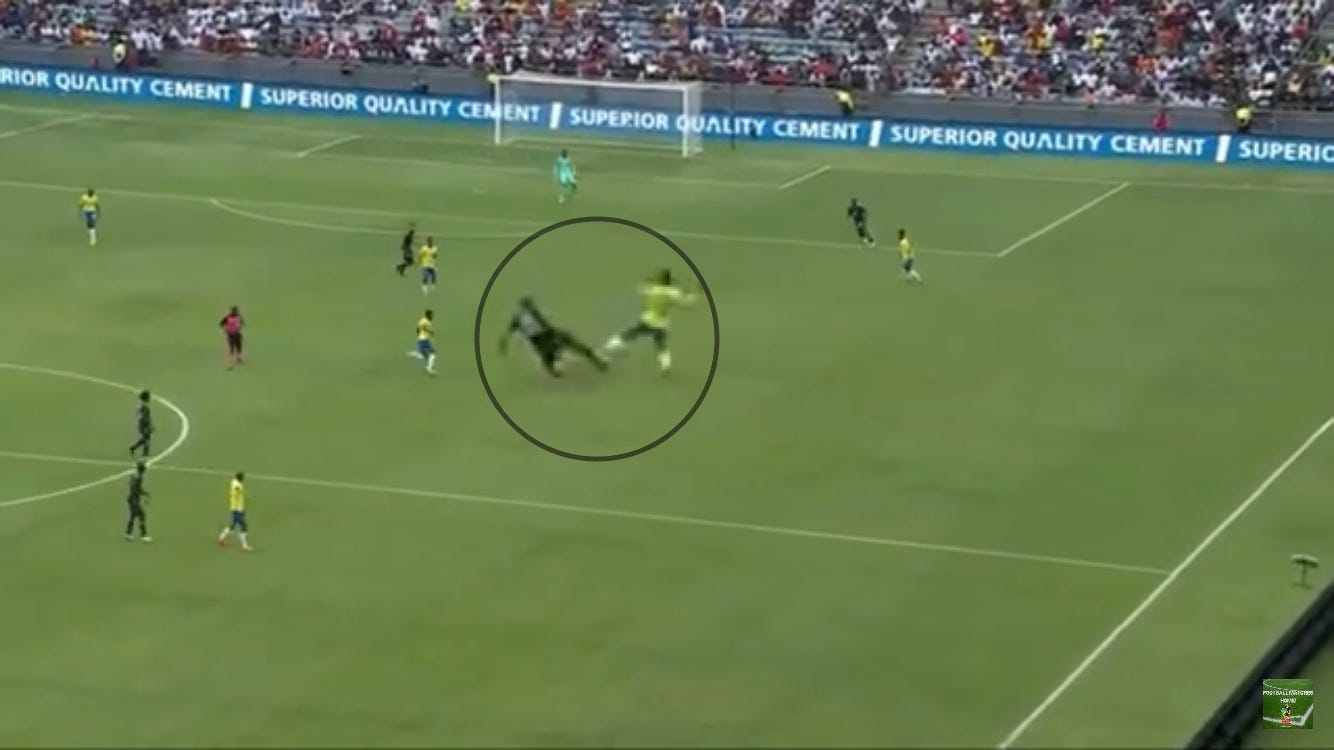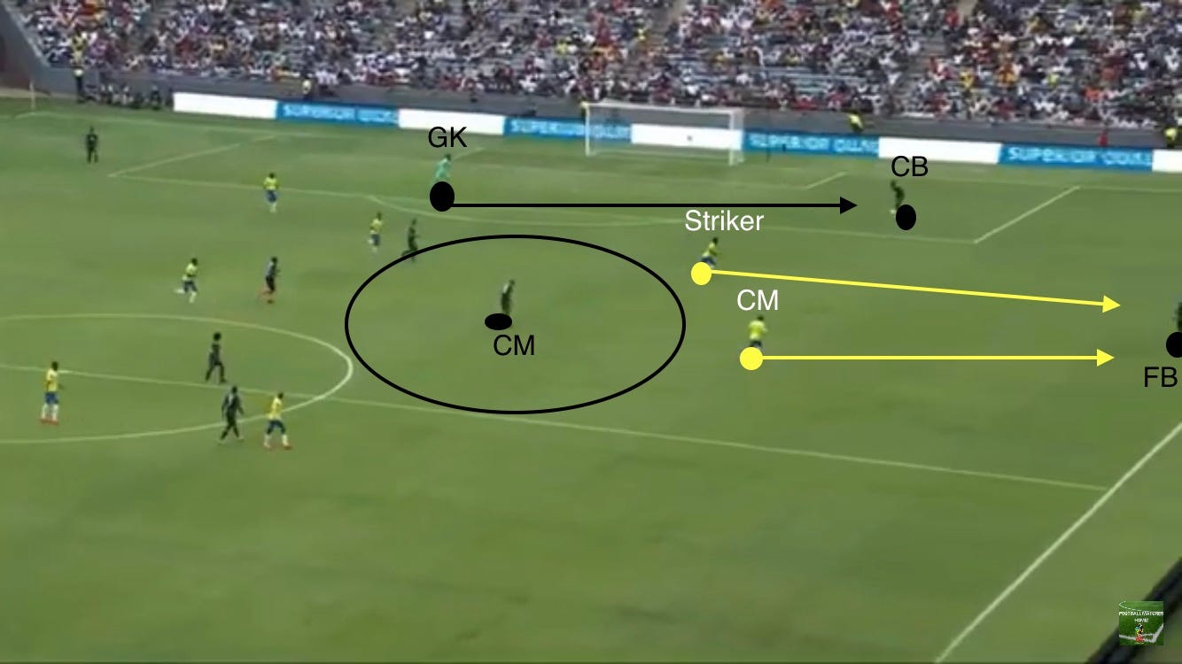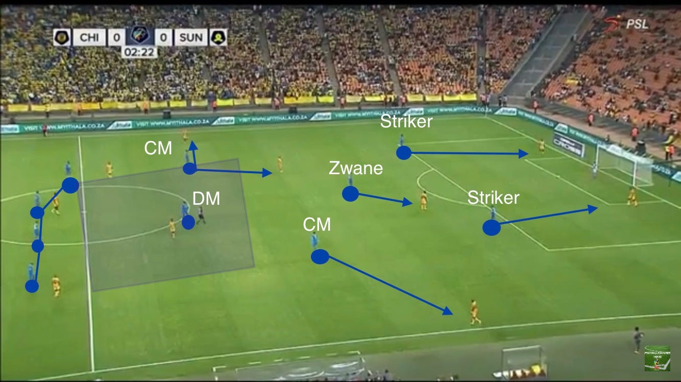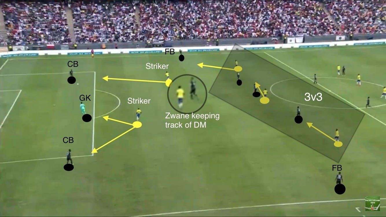 This is also the case when the opposition buildup with a back 3 (without the goalkeeper) as the central centre-back (above photo the DM) can drive centrally if the defensive midfielder pulls Zwane out of position.
