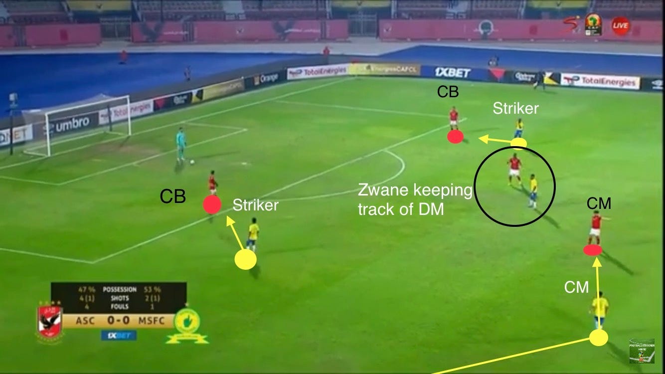 Sphelele Mkhulise(CM) was jumping to close down quickly Ali Maaloul (full-back) as it was for Marcelo Allende (CM) to Mohamed Hany (FB).