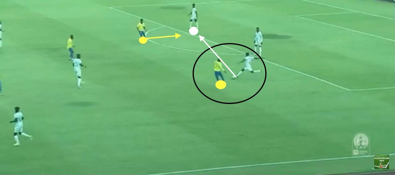Against Al Ahly, Sundowns used the same principle to make sure that Egyptians could not benefit from using their narrowness to progress the ball freely on the outside with Sundowns using a narrow 4-3-1-2.